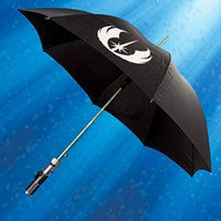 Even a Jedi Master needs protection against the elements, and this Yoda Lightsaber Umbrella is the perfect thing! The handle is based upon the famous lightsaber used by the 800 year-old, Yoda, while the shaft has been beautifully anodized in an iridescent green. The 100% black nylon canopy has the emblem of the Jedi Knights silk-screened on the sides. Comes complete with a sleek nylon carrying sleeve, with adjustable shoulder strap. Yoda sized and perfect for young Jedi.